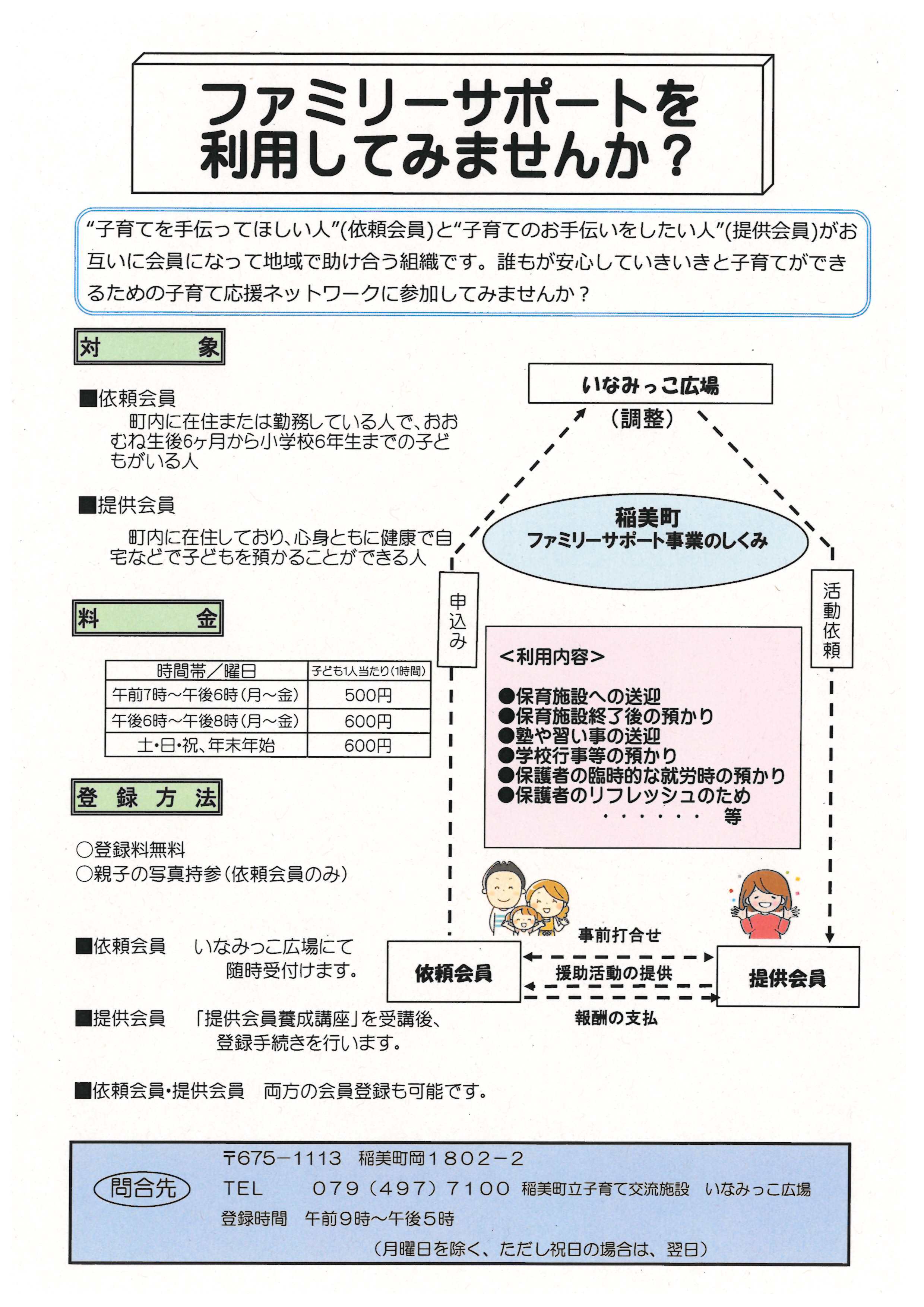 - 依頼会員:「いなみっこ広場」に依頼会員の登録をします。依頼したい内容について事前に申し込みをし、提供会員から援助活動の提供を受け、提供会員に直接報酬を支払っていただきます。
