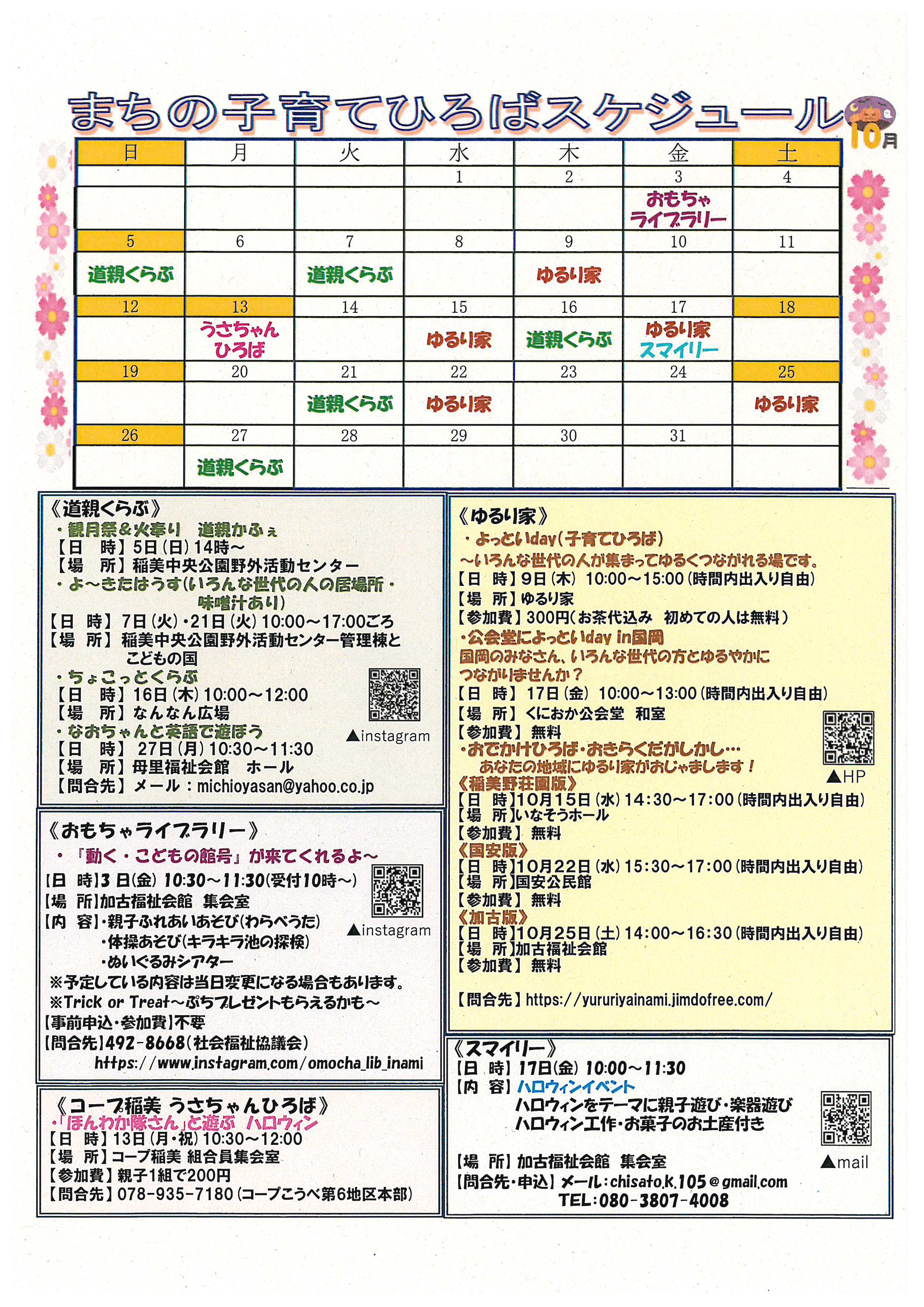 多世代が集まる子育てひろば『よっといday』、国岡の公会堂で多世代交流をしながら開催している『公会堂によっといday』、稲美中央公園の自然の中で開催している『冒険あそび場ゆるぱ』、だがしやさんを入り口としたこどもの居場所『放課後あそび場おきらくだがしかし…』、地域の公民館に出張する『おでかけひろば おきらくだがしかし…』、中高生の居場所『放課後居場所カフェまなぼぅや」、中学校内居場所『ゆるっちの里』『ゆる北』、こどもがつくるこどもだけのまち『こどものまち稲美』など。