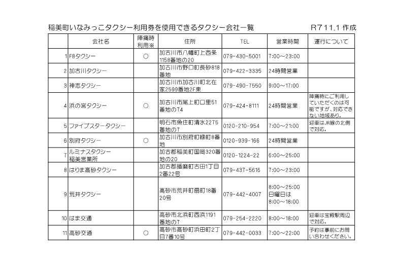 いなみっこタクシー利用券を使用できるタクシー会社一覧