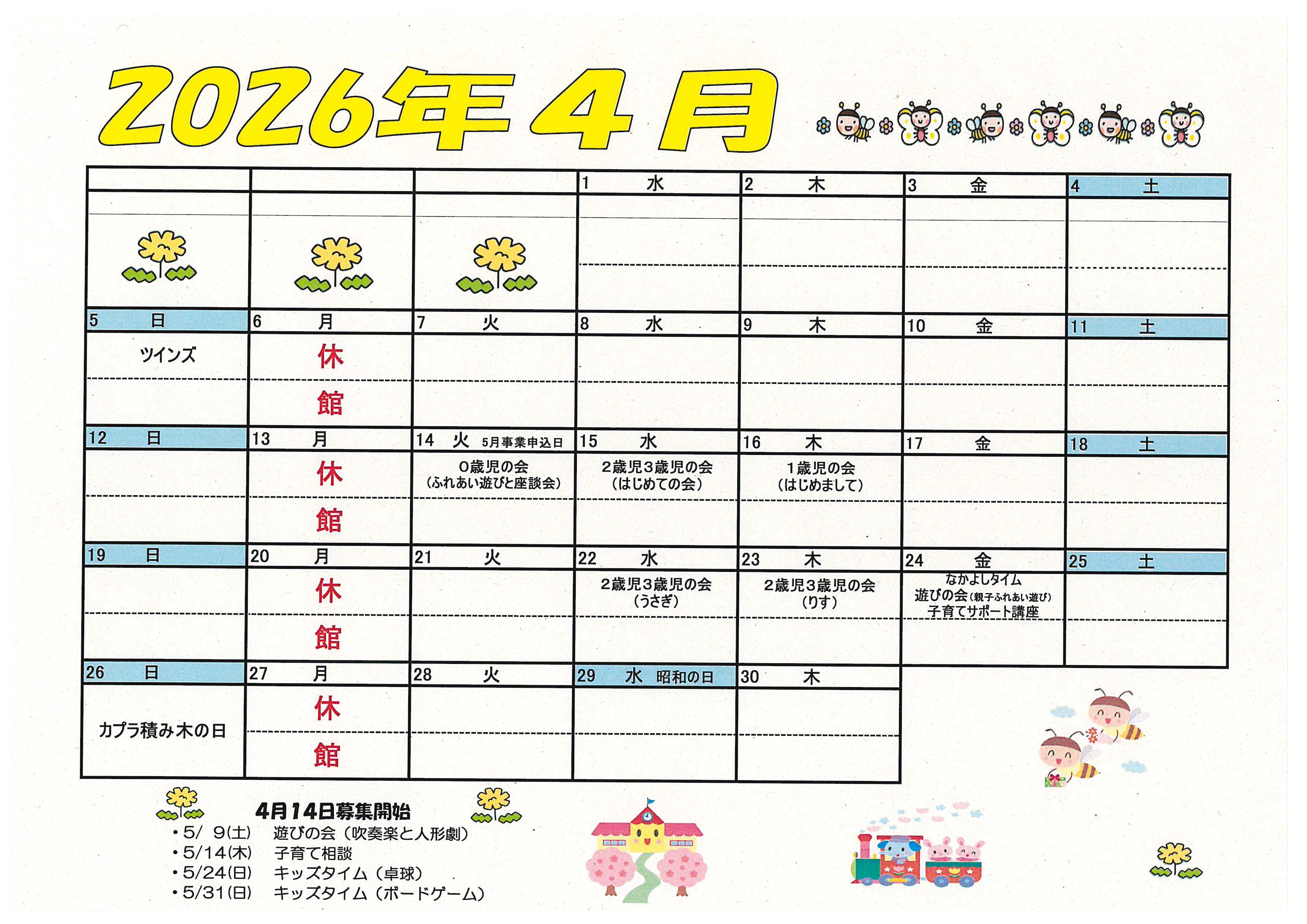 いなみっこ広場の子育て支援エリアで、令和8(2026)年4月(一部5月・6月)に開催する事業です。