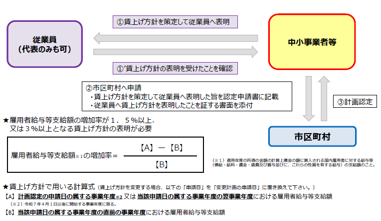 ※雇用者給与等支給額を1.5%以上引き上げる賃上げ方針で認定を受けた後、3%以上引き上げする賃上げ方針を策定される場合などには必要になります。また、賃上げ方針の内容を変更しない場合であっても、当該書面の提出が必要となる可能性があります。詳しくは中小企業庁ホームページ(別ウインドウで開く)のQ&Aをご確認ください。