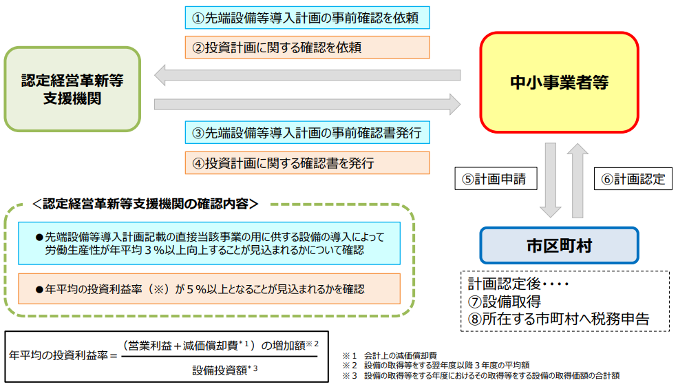 ※先端設備等導入計画の認定を受けて税特例の手続きを行っても、税務の要件(取得価格や中古資産でない等)を満たさない場合は税制の適用が受けられませんのでご注意ください。