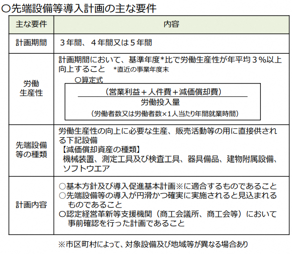 「先端設備等導入計画」は、中小企業等経営強化法に規定された中小企業者が、設備投資を通じて労働生産性の向上を図るための計画です。この計画は、町が国から「導入促進基本計画」の同意を受けている場合に、町から認定を受けることができます。