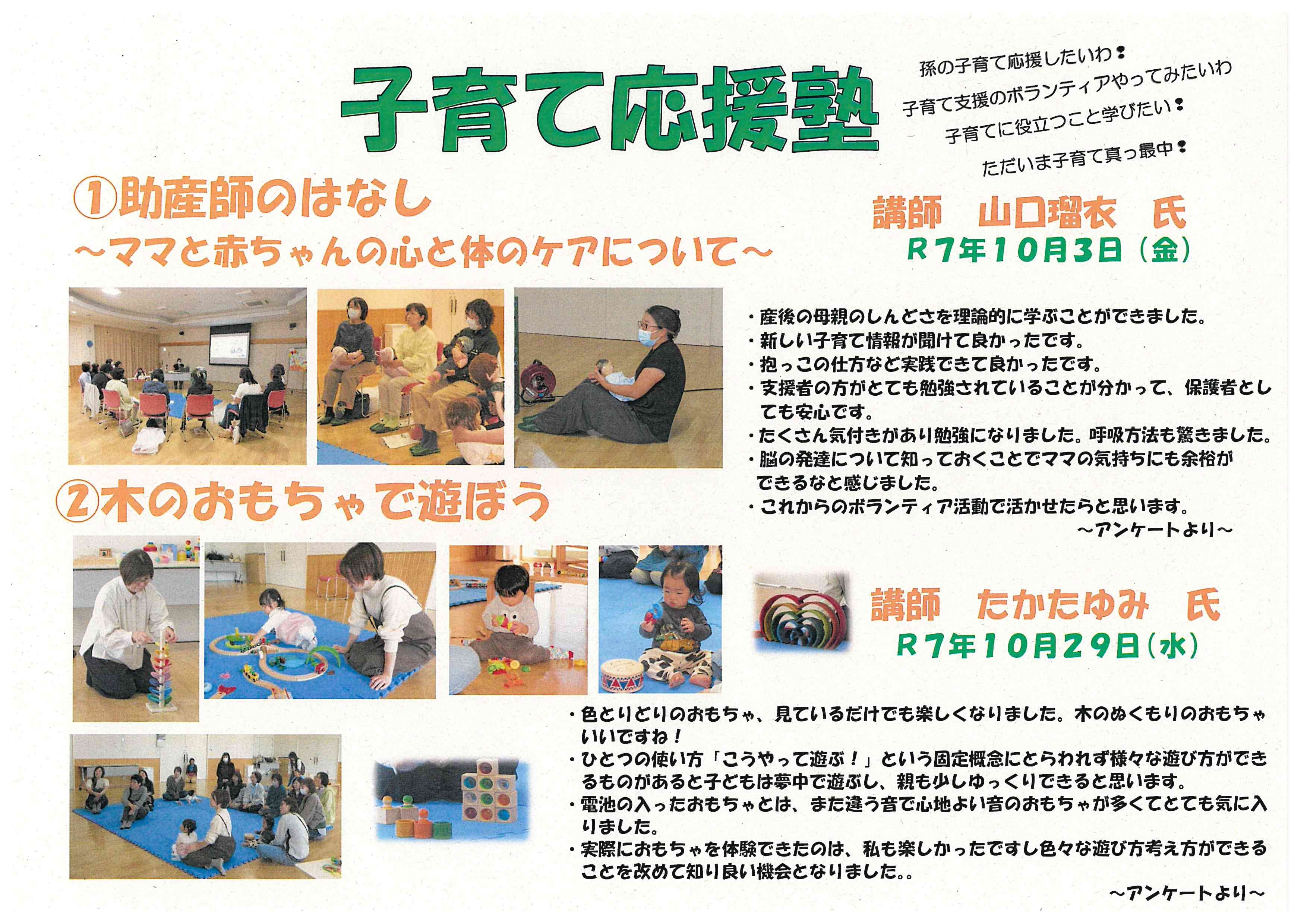 ▲ 令和7(2025)年10月3日.29日 子育て応援塾「助産師のはなし」「木のおもちゃで遊ぼう」
