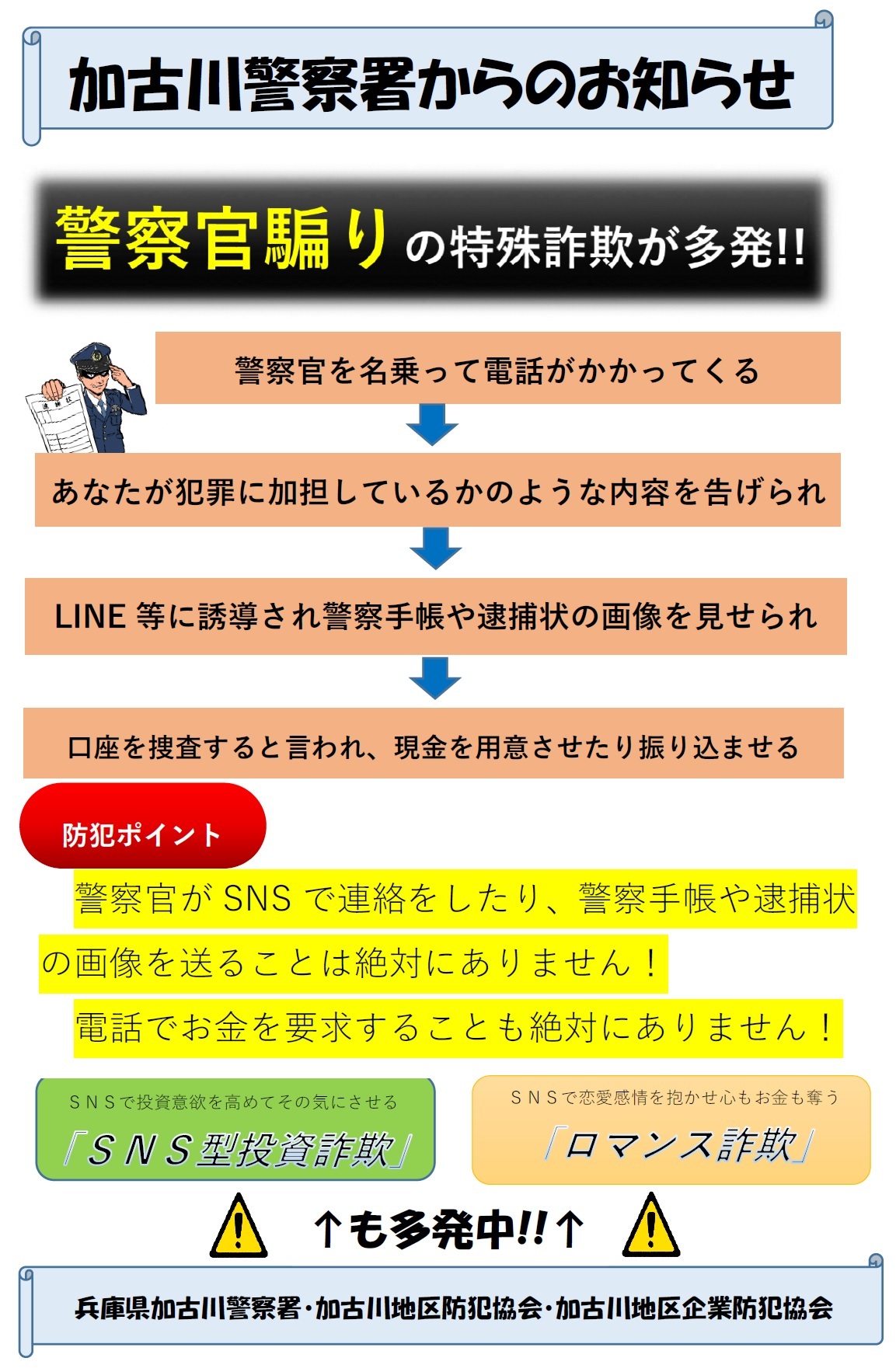 ↑チラシ「警察官騙りの特殊詐欺が多発!!」(加古川警察署・加古川地区防犯協会・加古川地区企業防犯協会発行)