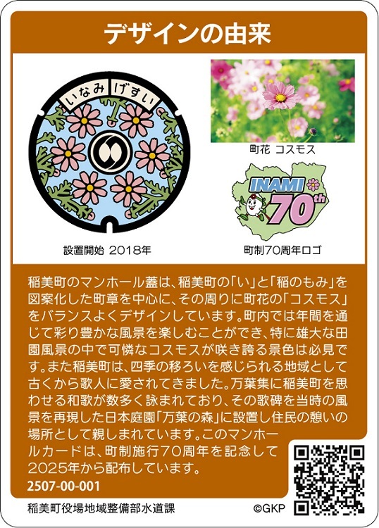 本町も下水道の啓発活動の一環として、快適で安全な暮らしを支えている下水道に関心をもってもらい、また下水道に親しみを感じていただくために令和7(2025)年11月1日からマンホールカードを配布しています。