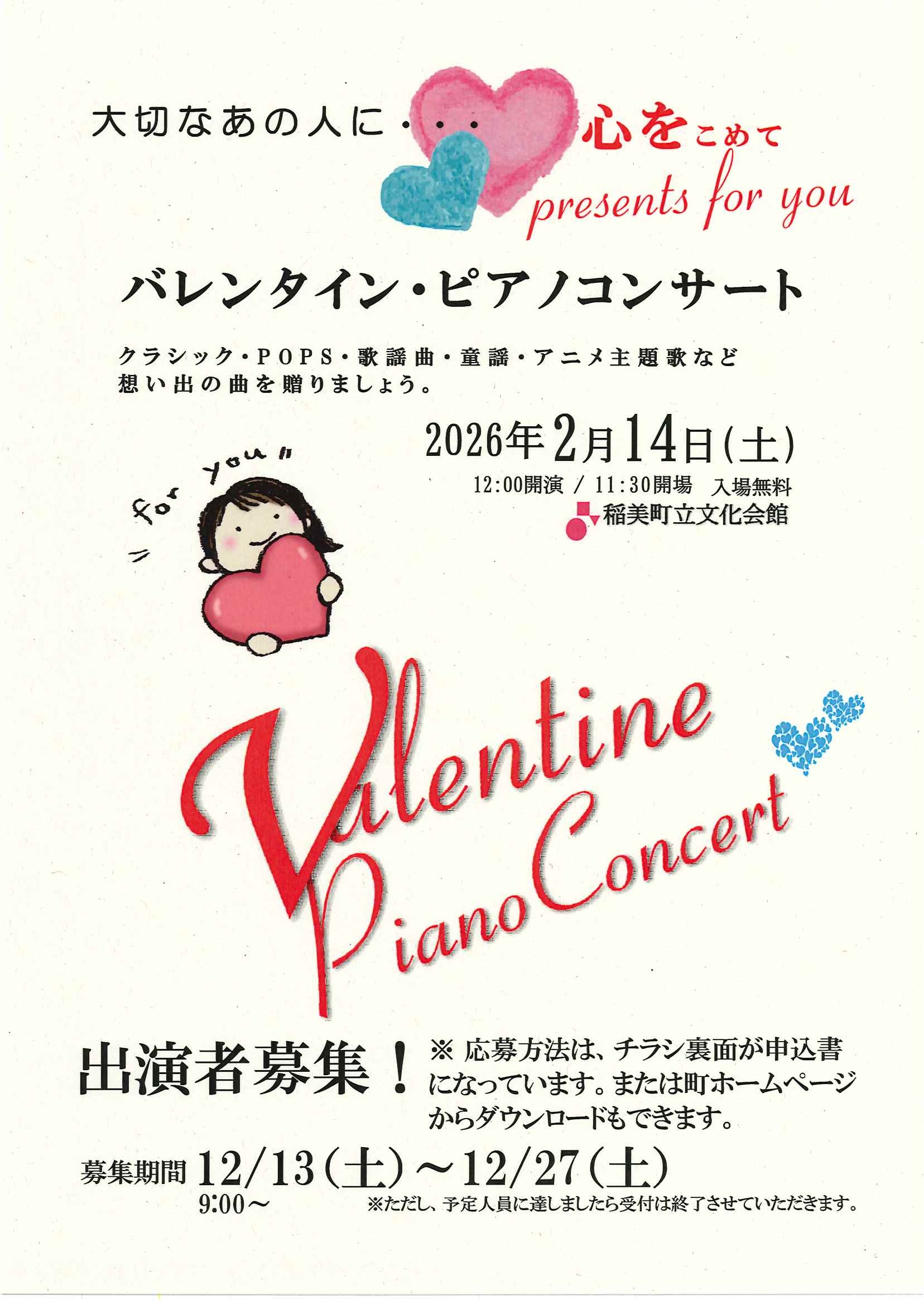 町制施行70周年記念事業 バレンタイン・ピアノコンサート出演者募集のご案内