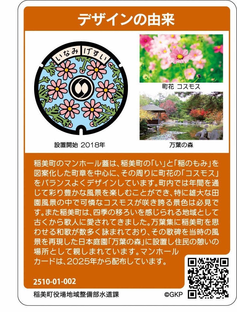 マンホールカードは、下水道広域プラットフォーム(事務局:公益社団法人日本下水道協会)が行っている下水道の広報活動の一つとして、各自治体と共同して作成し無料で配布するカード型の下水道広報パンフレットです。