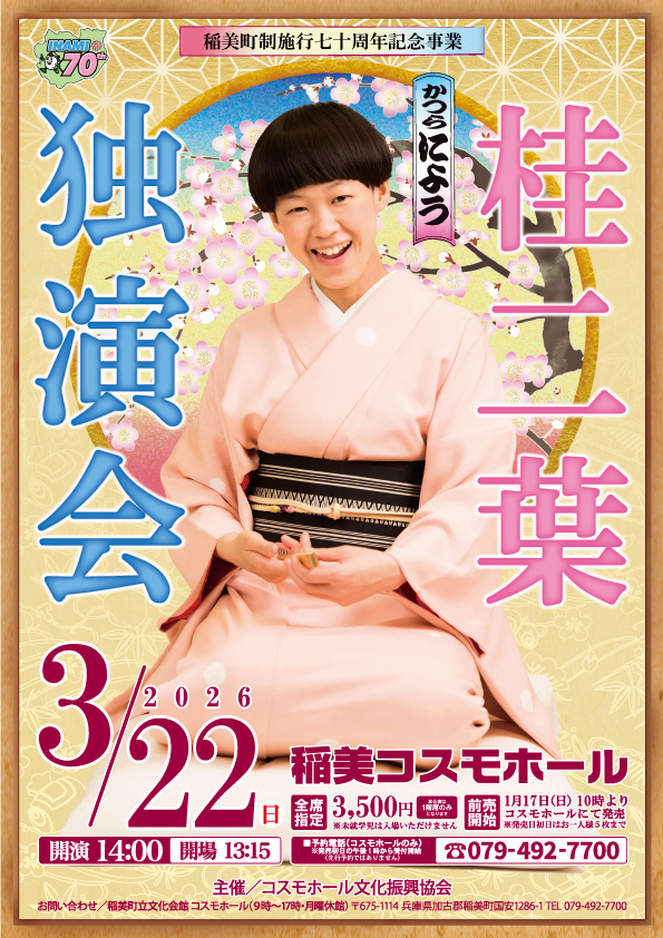 町制施行70周年記念事業 桂 二葉 独演会を開催します。皆さんのご来場をお待ちしています。