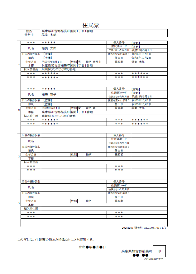 稲美町に転入する前の住所が記載されます。その後町内で転居した場合でも「転入前住所」が継続して表示され、これまでの「前住所欄」は廃止されました。