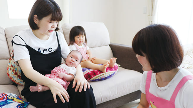 4ヵ月までの赤ちゃんのいる家庭を助産師・保健師が訪問。乳児の健康状態のチェックや育児に関するアドバイスを行うなど、きめ細かくサポートします。